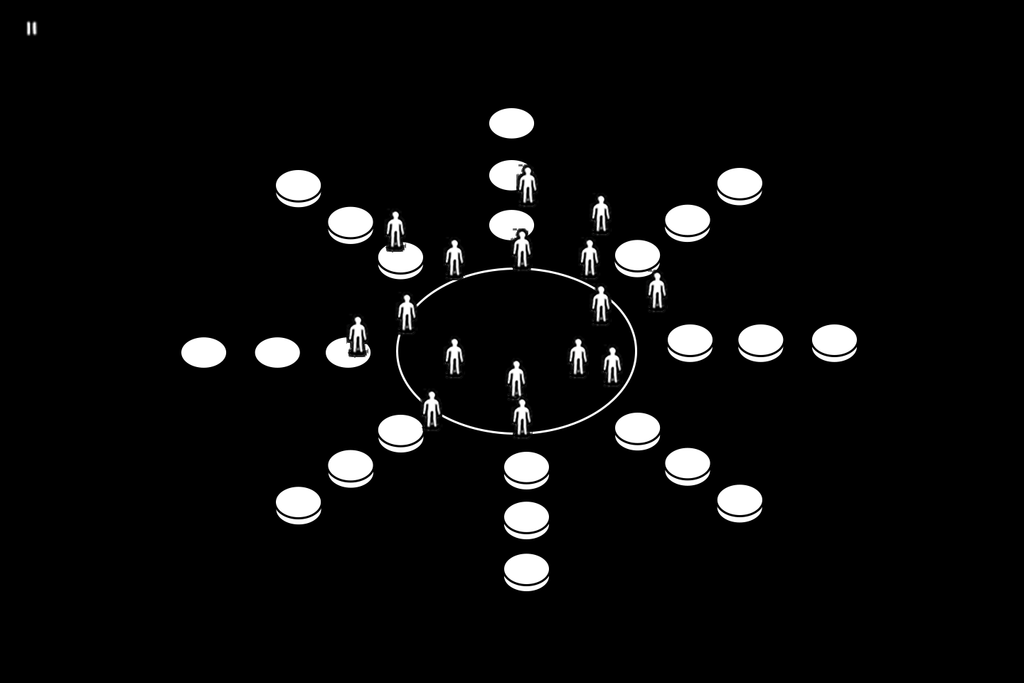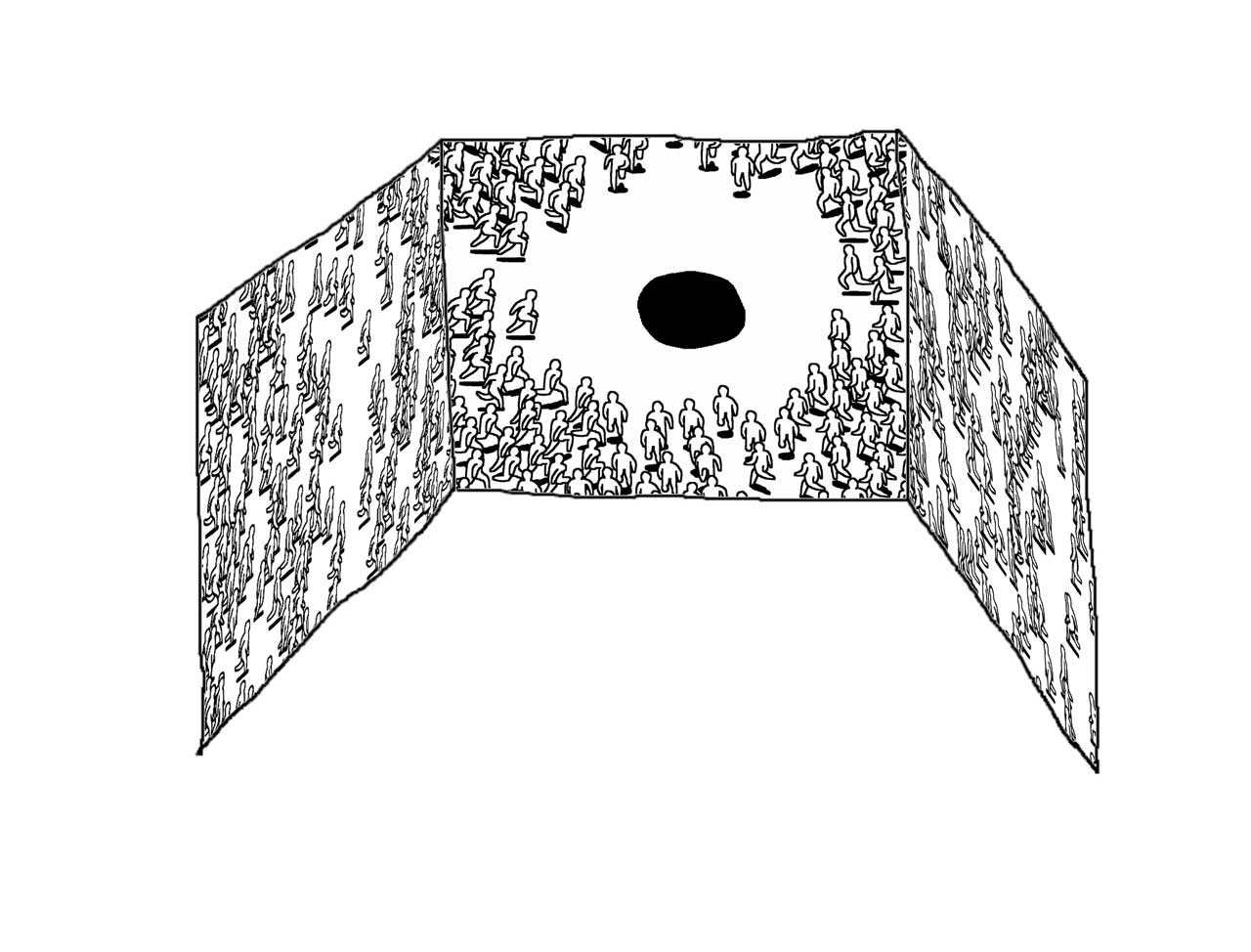 After experimenting with body tracking, we decided to simplify the interaction: instead of tracking the spectators' movement in front of the projection, we only tracked the number of people in the room. We wanted people to watch and experience the space, not trying to wave their arms to get feedback.